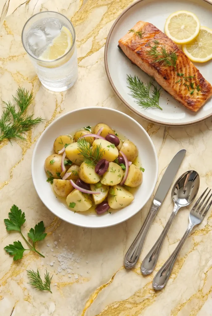 Greek potato salad pairs beautifully with dishes that enhance its bold, tangy notes. Enjoy it with grilled chicken, lamb, or salmon for a complete meal. Garnish with a sprinkle of toasted seeds, crumbled feta, or edible flowers for visual appeal. Beverage-wise, chilled sparkling water, white wine, or craft beer complements the salad’s bold flavors. These pairings turn a simple dish into a memorable dining experience.